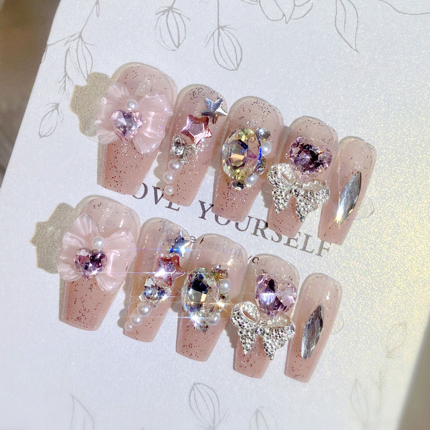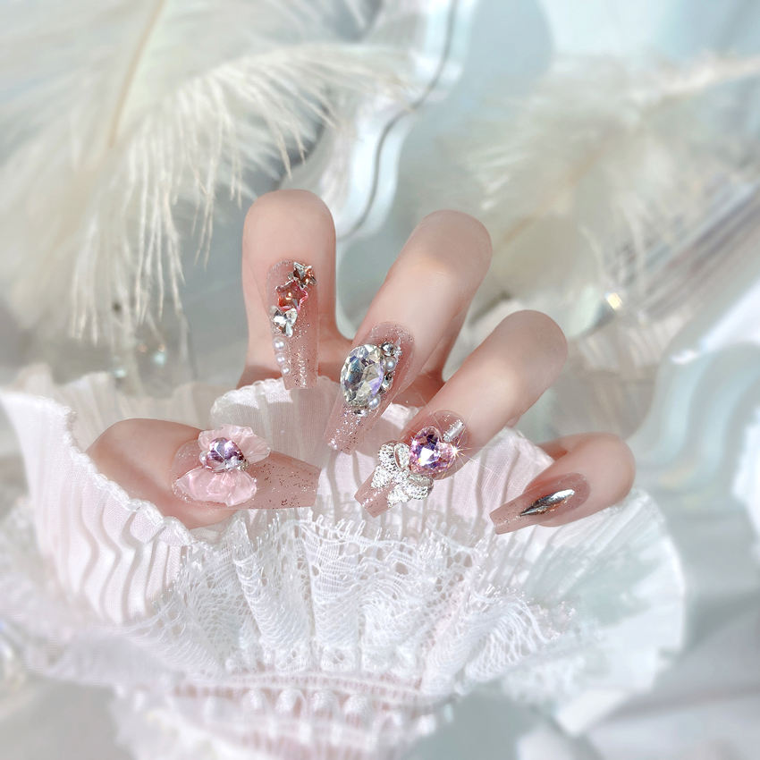 The combination of glitter and artificial diamonds creates a glamorous, eye-catching look that aligns with current European and American fashion trends. The rose and butterfly motifs add a romantic, feminine touch, making the nails suitable for various occasions—whether it’s a casual outing, a date, or a special event.