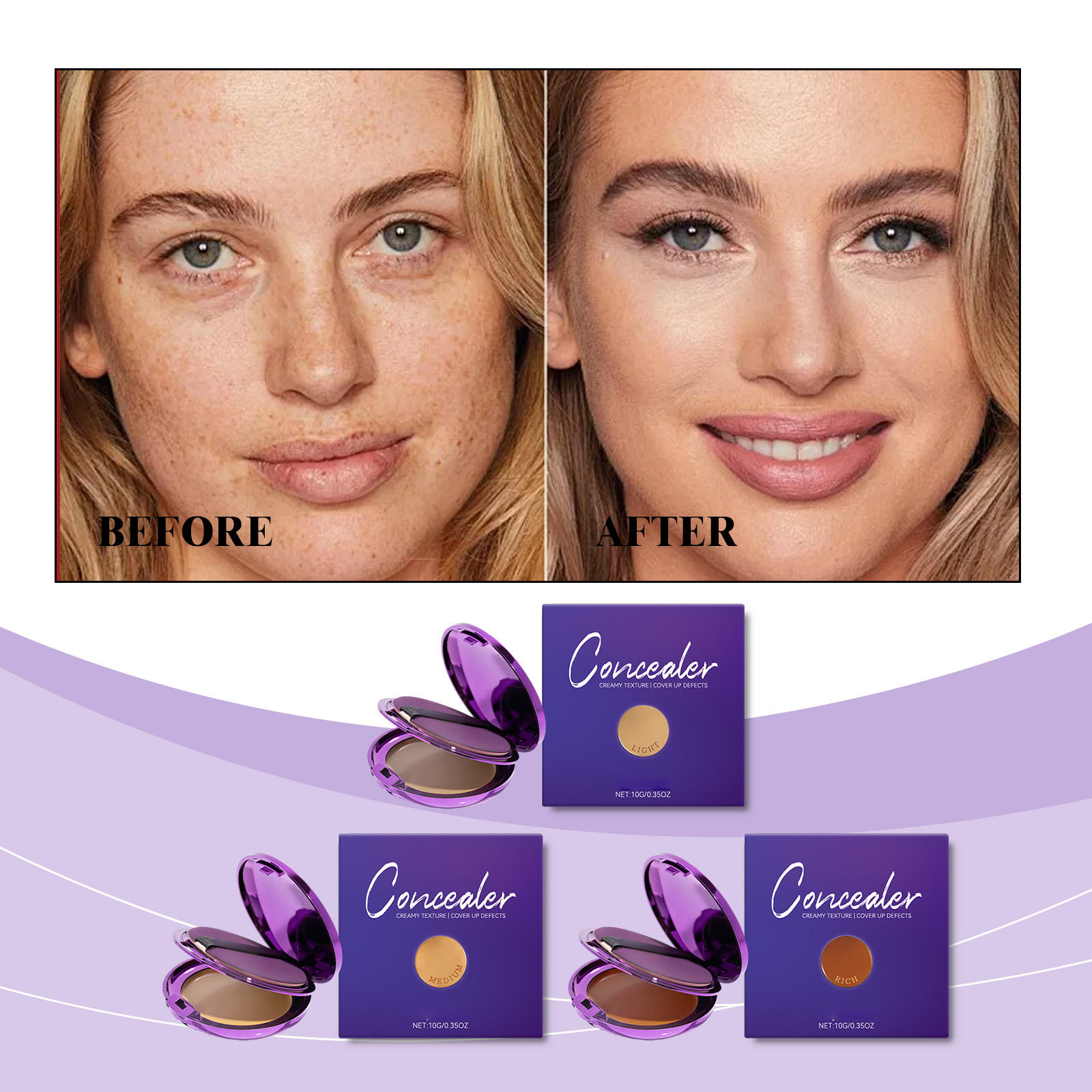 Powerful Concealing: Effectively covers blemishes, dark circles, and other skin imperfections, as demonstrated by the “before – after” comparison in the image.