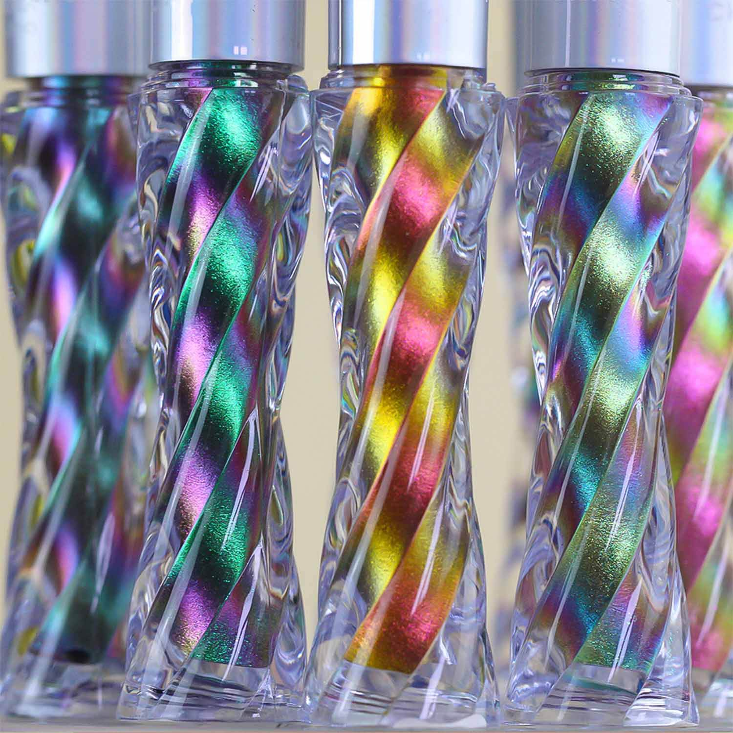 The shimmer and metallic wet pigments add a dazzling, sparkling finish that enhances the eye-catching appeal of the multichrome, holographic, and chameleon effects, creating a glamorous, attention-grabbing look.