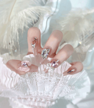 The combination of glitter and artificial diamonds creates a glamorous, eye-catching look that aligns with current European and American fashion trends. The rose and butterfly motifs add a romantic, feminine touch, making the nails suitable for various occasions—whether it’s a casual outing, a date, or a special event.